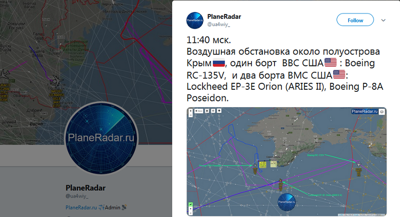 Ce mercredi, le site internet PlaneRadar qui surveille les vols d’avions militaires a annoncé que trois avions espions américains — un Boeing RC-135V, un Boeing P-8A Poséidon et un Lockheed ЕР-3Е Orion (Aries II) — avaient mené des missions non loin des frontières russes en mer Noire.