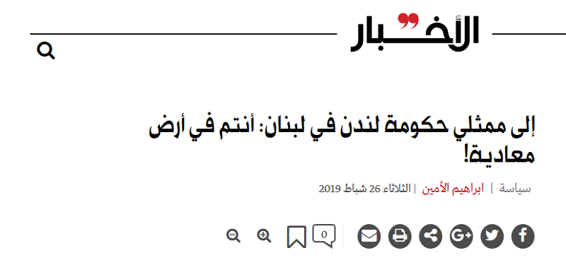 « Aux représentants du gouvernement de Londres au Liban : vous êtes en terre ennemie », a-t-il intitulé avec fougue son éditoriale de ce mardi 27 février.