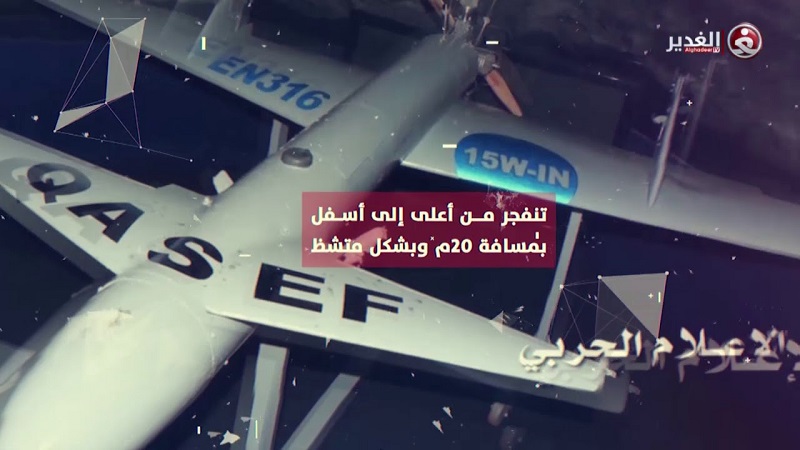 Selon Média de guerre , instance médiatique d’Ansarullah, Qasef-K2, le drone de fabrication yéménite qui est entré en action dans cette guerre à partir du mois de janvier dernier, explose du haut vers le bas a une distance de 20 mètres de sa cible en propulsant ses éclats. Il peut transporter une grande quantité de produits explosifs, des caméras de haute précision et dispose d’une capacité à capter rapidement sa cible.
