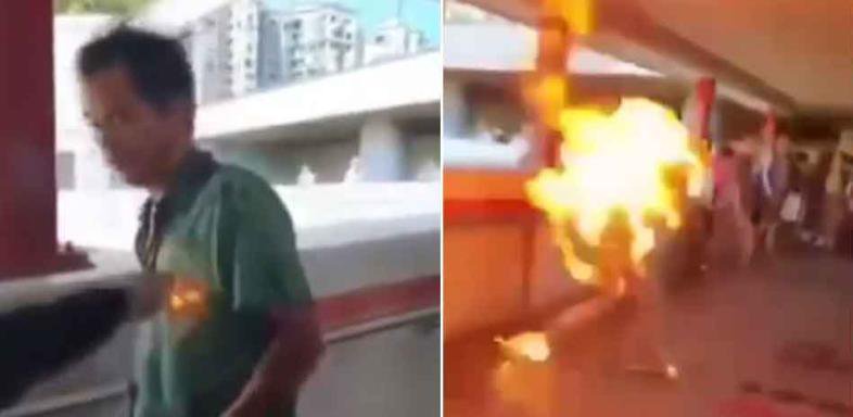 Une des vidéos montre un homme en noir aspergeant la victime avec un liquide avant d’y mettre le feu, semant la panique chez les personnes autour.