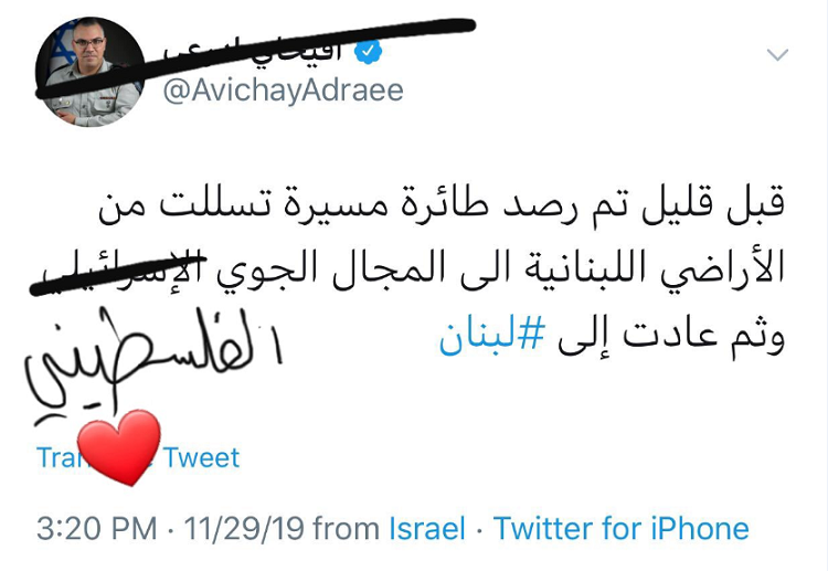 « Un drone s’est infiltré depuis les territoires libanais, a violé l’espace aérien israélien puis est revenu au Liban », a tweeté Avichay Adraee.