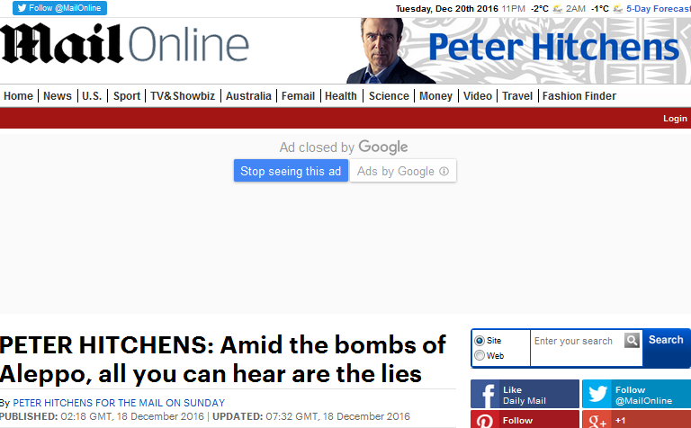 Peter Hitchens, un chroniqueur britannique du Daily Mail, affirme que les « brillants reportages » prétendument filmés sur le terrain à Alep et diffusés en grande quantité ces derniers jours par les médias britanniques ont été préparés par des personnes se trouvant dans d’autres pays…
