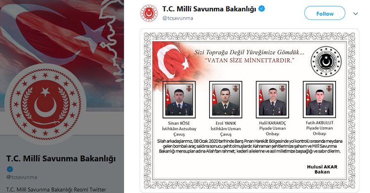 L’explosion d’une voiture piégée dans le nord-est de la Syrie a coûté la vie à quatre soldats turcs, le ministère turc de la Défense nationale a présenté ses condoléances aux familles endeuillées.