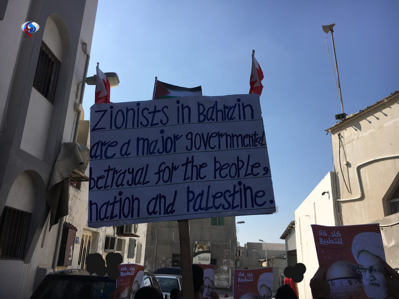 Les manifestants ont dénoncé « la visite de la délégation sioniste qui traduit la politique officielle d’un régime despote qui se moque de la volonté du peuple et ne peut en aucun cas justifier cette visite ni les efforts du régime qui cherche à reflèter une fausse image du Bahreïn, un pays qui, tout au long de son histoire , se tient aux côtés des Palestiniens et soutient leur cause sans relâche « .