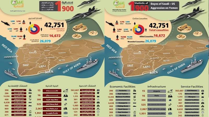 Le Centre Ain Al-Insania pour les droits de l’homme a publié un rapport statistique sur l’ampleur des pertes civiles subies par les yéménites durant les 1900 jours de guerre lancée par la coalition saoudo-américaine contre ce pays le pauvre de la péninsule arabe.