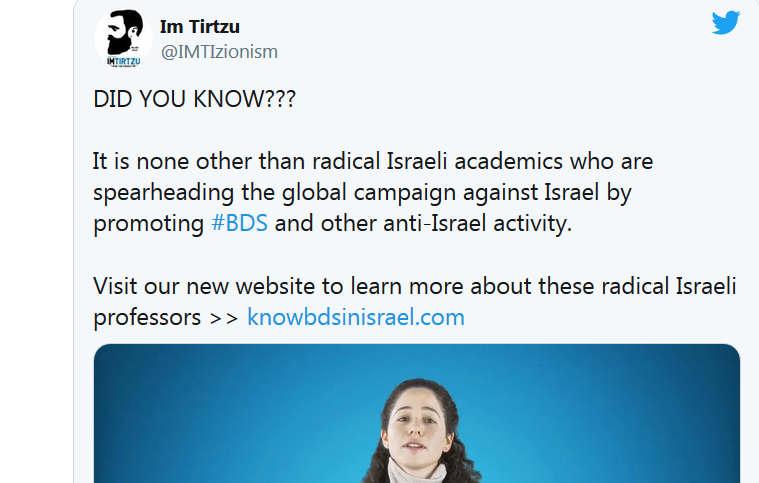 D’après un article du Jerusalem Post publié le 24 juin 2020, un nouveau site Web en anglais lancé par l’organisation ultra-sioniste Im Tirtzu, a répertorié environ 150 professeurs israéliens connus pour s’être engagés dans des activités anti-israéliennes.