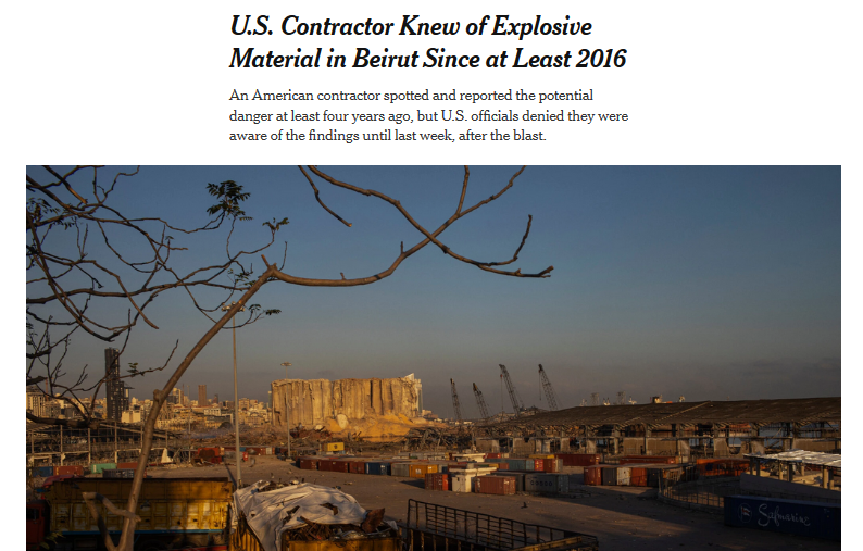 C’est ce qu’a révélé le quotidien américain New York times dans un article publié ce mardi 11 août. Se basant sur la teneur d’un câble diplomatique publié le vendredi 7 août, trois jours après la double explosion au nitrate d’ammonium du port de Beyrouth qui a tué plus de 170 personnes, blessé plus de 6.000 et détruit plusieurs quartiers de la capitale libanaise. Sans compter les 40 personnes encore portées disparues.