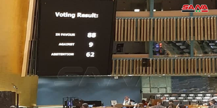 Selon l’agence syrienne Sana, 88 états ont voté en faveur d’un projet de résolution affirmant ce droit, présenté par la Syrie, tandis que 8 états et l’entité d’occupation israélienne se sont opposés et 62 états se sont abstenus de voter.