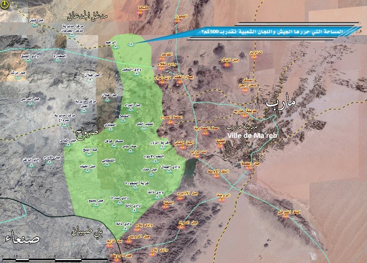Appuyant ses propos en exposant sur une carte géographique les zones conquises, il a indiqué que les forces armées yéménites sont désormais présentes sur le côté nord du barrage de Ma’rib.
