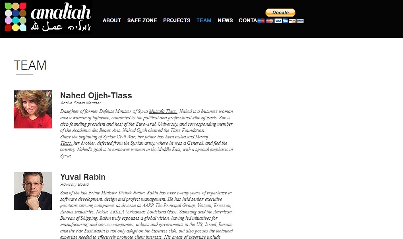 C’est le cas d’une ONG israélienne, Amaliah et qui veut dire Action de Dieu. Elle compte parmi ses membres Nahed Tlass Oejjeh, la fille de l’ancien ministre syrien de la Défense et compagnon de route de l’ancien président syrien Hafez al-Assad Moustapha Tlass, ainsi que Youval Rabin, le fils de l’ancien Premier ministre israélien Itzhak Rabin, tué en 1995.