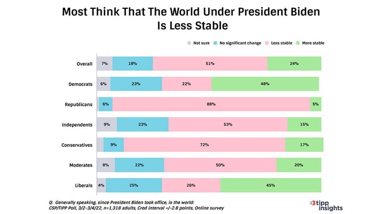 Le sondage a mis en évidence une nette différence entre les lignes de parti, avec 22% des démocrates, 88% des républicains et 53% des indépendants estimant que « le monde est devenu moins sûr » depuis que le président Biden a pris ses fonctions.