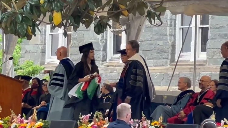 Lors de la remise de son diplôme, une étudiante qui est montée sur l’estrade, portant le drapeau palestinien a refusé de serrer la main à Blinken.
