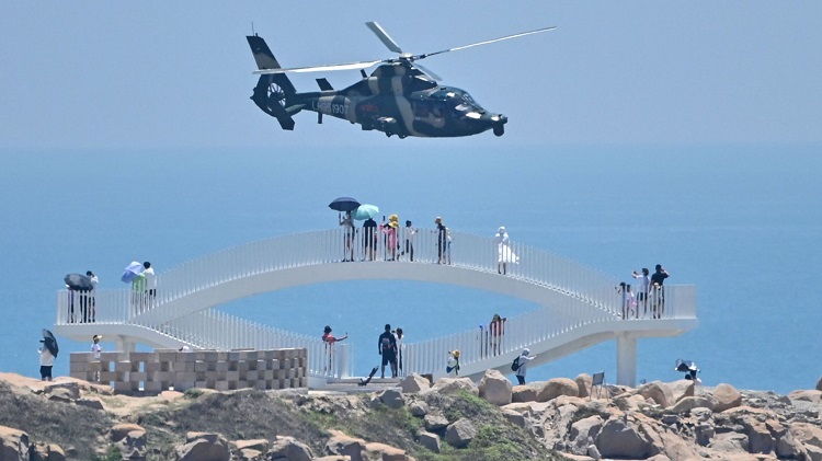 À Pingtan, une île chinoise située près des manœuvres en cours, les reporters ont vu plusieurs projectiles tirés à proximité d’installations militaires s’envoler dans le ciel vers la mer, suivis de panaches de fumée blanche.