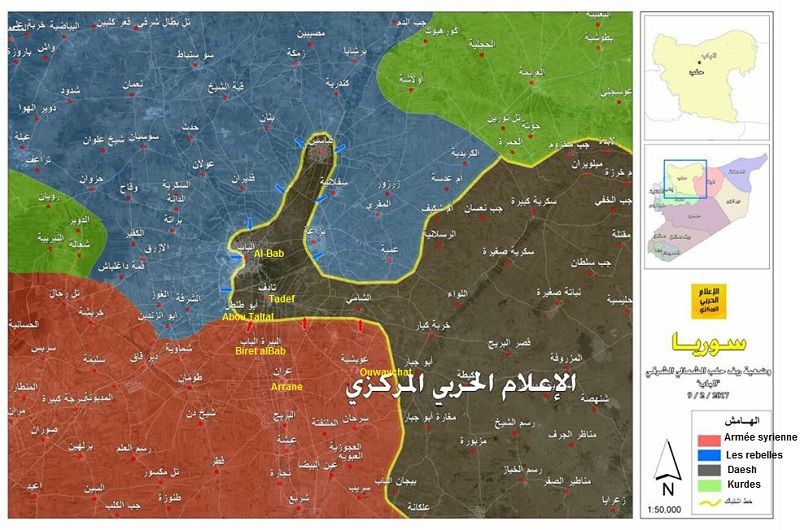 Alors que les forces gouvernementales qui se dirigent vers la ville d’al-Bab avaient pris le contrôle des deux localités, Deir Qaq et d’al-Chamavariya, également à l’ouest. Ces derniers jours, elles avaient conquises selon Média de guerre les villages de Arranem Ouwaychat, Hawwarat-Tadef, al-Maazoulat, Biret alBab, les fermes de Biret, Toumane . (Voir carte)