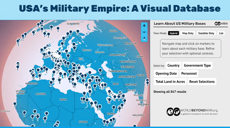 World Beyond War a lancé un nouvel outil en ligne qui permet aux utilisateurs de visualiser un globe marqué de 867 bases militaires américaines dans des pays autres que les États-Unis, et de zoomer pour obtenir une vue satellite et des informations détaillées sur chaque base. L’outil permet également de filtrer la carte ou la liste des bases par pays, type de gouvernement, date d’ouverture, nombre d’employés ou superficie de terrain occupée.