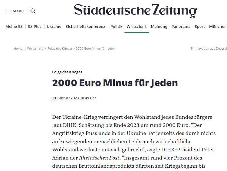 La guerre en Ukraine aura coûté à l’économie allemande environ 160 milliards d’euros (171 milliards de dollars), soit quelque 4 % de sa production intérieure brute, en perte de création de valeur d’ici la fin de l’année, a déclaré le chef des Chambres allemandes de l’industrie et du commerce (DIHK).