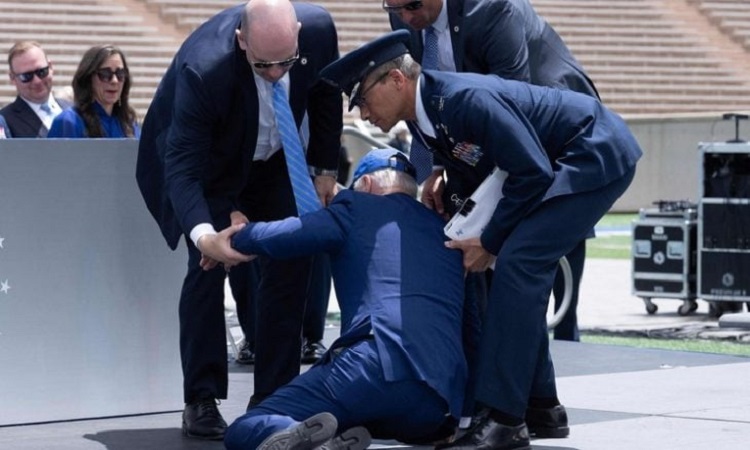Le démocrate, qui venait de remettre des diplômes à des élèves de l’académie de l’armée de l’air dans le Colorado, est tombé vers l’avant, se réceptionnant sur les genoux et les mains, après avoir apparemment trébuché sur un sac noir.