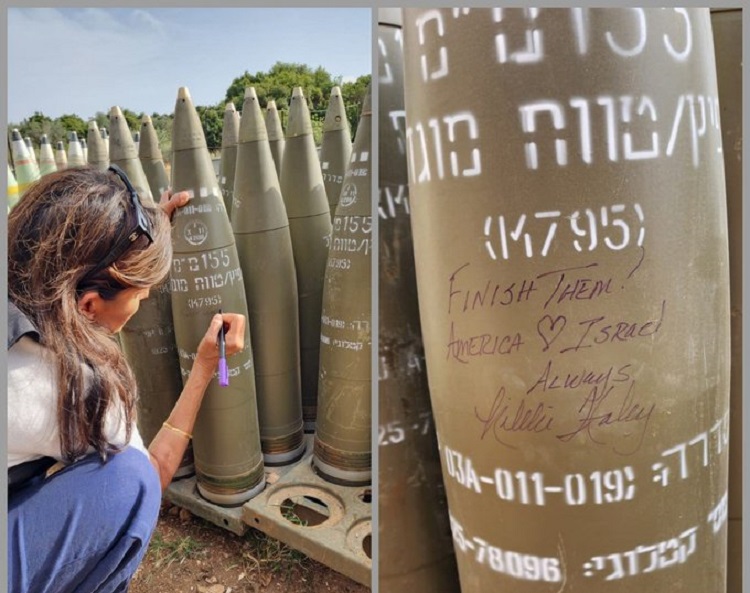 🚨🇺🇸 Nikki Haley writes “finish them” on a shells that will be used to BOMB innocent CHILDREN and CIVILIANS… pic.twitter.com/K675vfhjPb