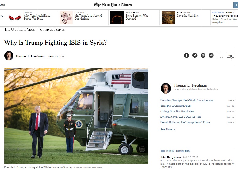 Visiblement, Thomas Friedman est un fervent défenseur de cette instrumentalisation de Daech contre Bachar el-Assad et ses soutiens étrangers, une politique si inavouable pour les autorités américaines qu’elle fut sous-traitée en toute connaissance de cause à leurs alliés turcs et pétromonarchiques. Confirmant maladroitement que le Pentagone et ses partenaires ne combattaient pas réellement l’EI en Syrie sous la présidence Obama, cet éditorial de Thomas Friedman semble refléter la colère des faucons américains face à un potentiel revirement stratégique sous la présidence de Donald Trump, qui se traduit malheureusement par un lourd bilan humain dans les zones occupées par Daech.