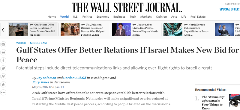 Le quotidien américain Wall Street Journal a révélé l’existence d’un document ultra secret dans lequel les monarchies du Golfe s’engagent à établir les meilleures relations avec l’entité sioniste au cas où cette dernière est disposée à reprendre le processus de paix avec les Palestiniens.
