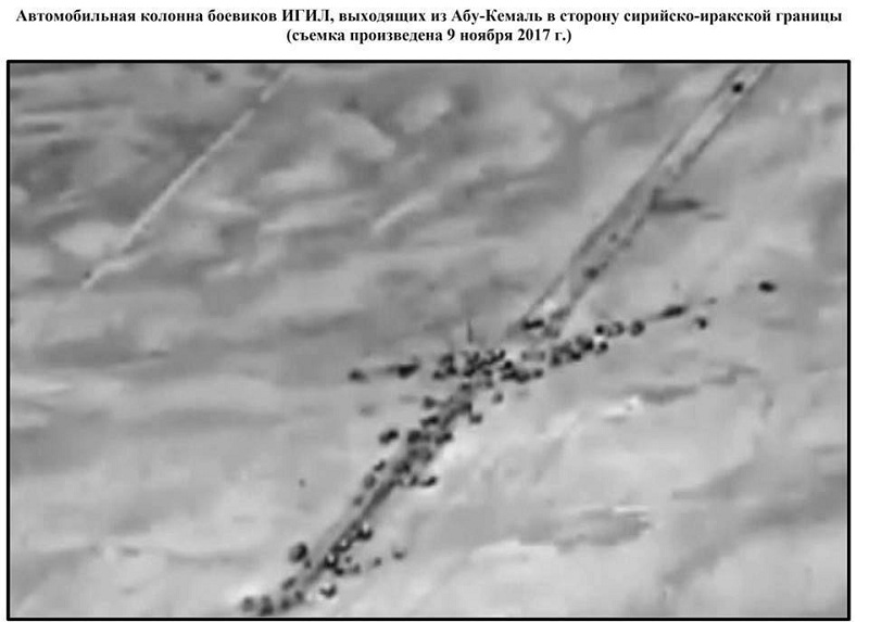 Pour appuyer ses affirmations, le ministère a fourni des clichés pris le 9 novembre par des drones russes. Les photos montrent des détachements de Daech fuir la ville syrienne d’Abou Kamal, considérée encore récemment comme son dernier fief en Syrie, et reprise la semaine dernière par les troupes gouvernementales.