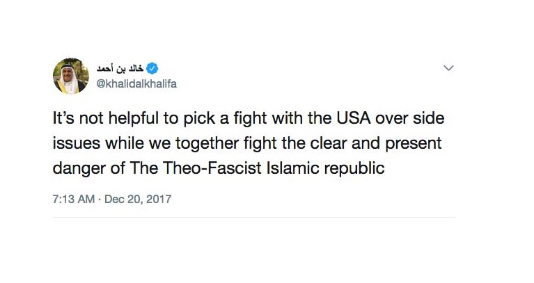 S’adressant à ses 460.000 followers sur Twitter, al-Khalifa a écrit: « Il n’est pas utile d’entrer en conflit avec les Etats-Unis sur des problèmes secondaires alors que nous confrontons ensemble le danger clair et réel de la République islamique théo-fasciste », en allusion à l’Iran.
