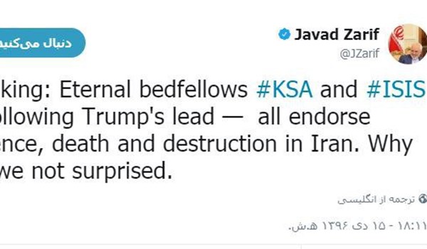 Le ministre iranien des Affaires étrangères, Mohammad Javad Zarif, a commenté le soutien exprimé par Daech aux émeutiers iraniens. « L’Arabie saoudite et Daech forment les deux faces d’une même de monnaie. Elles ont soutenu Trump dans sa campagne de violence, de meurtre et de destruction en Iran », a-t-il écrit sur son compte Twitter selon l’agence d’informations iraniennes Farsnews.