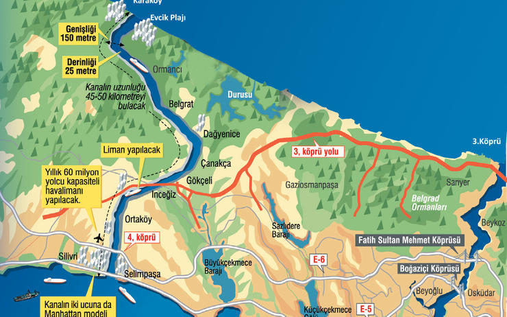 Le ministre des Transports et des Communications, Ahmet Arslan, a annoncé que le canal démarrerait au niveau du lac de Küçükçekmece, sur la rive européenne d’Istanbul, près de la mer de Marmara, et débouchera dans la mer Noire au niveau de Durusu.