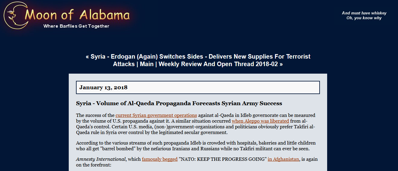 Les rédacteurs néoconservateurs de WaPo tiennent leurs idées du célèbre organe de propagande, the institute for the study of war (Institut pour l’étude de la guerre). Lorsque les zones de désescalade ont été introduites en Syrie suite à de négociations entre la Russie, l’Iran, la Turquie et les États-Unis, Al-Qaïda et l’État islamique en ont été exclus.