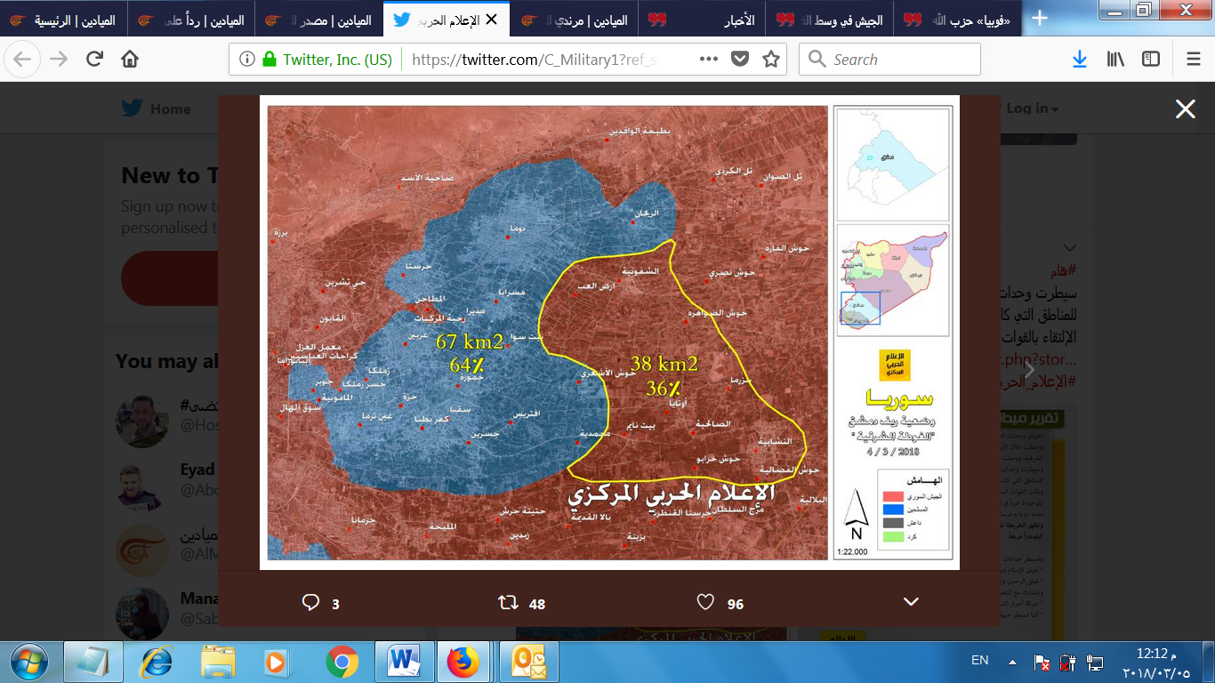 Mais selon Média de guerre, 36% ou l’équivalent de 38 km2 de cette surface est désormais libérée.Les forces gouvernementales se trouvent aux abords de Mesraba et de Beit Sawa, après avoir conquis la région qui longe le sud de la localité de Chifoniyat jusqu’au nord de Hoche al-Achaari, ajoute l’instance médiatique de la Résistance.