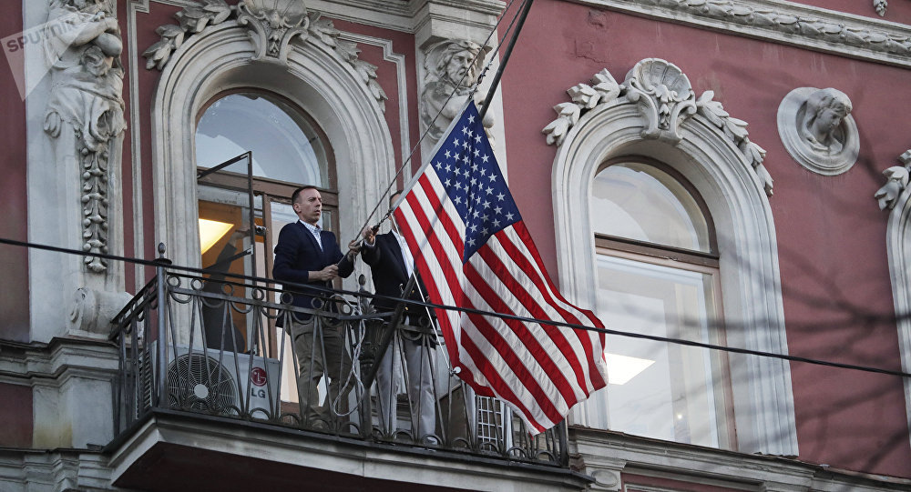 Le drapeau national des États-Unis a été retiré du bâtiment du consulat général américain à Saint-Pétersbourg samedi soir par deux employés de la mission diplomatique.