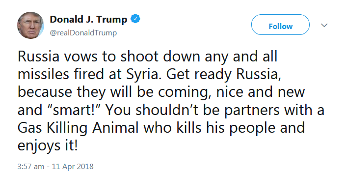 « La Russie promet d’abattre tous les missiles lancés contre la Syrie. Préparez-vous la Russie, parce qu’ils viendront, gentils, nouveaux et «intelligents!» Vous ne devriez pas être des partenaires avec un animal qui gaze son peuple et l’apprécie! », a-t-il tweeté ce mercredi 11 avril, a rapporté le site arabophone de l’agence russe Sputnik.