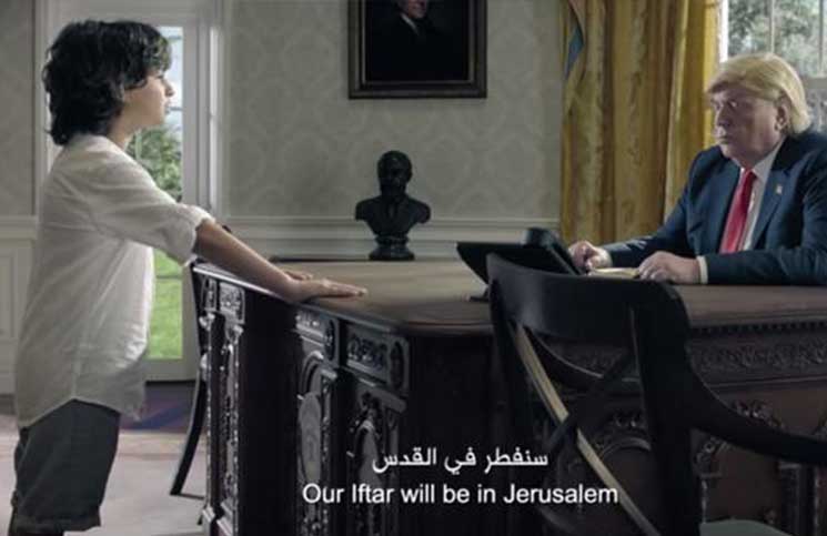 Bien qu’elle ait été diffusée par une entreprise privée, la publicité délivre un message éminemment politique. Elle évoque – entre autres – les “souffrances des réfugiés”, mais surtout la question palestinienne et le “transfert de l’ambassade américaine” de Tel Aviv vers la Ville Sainte. AlQuds occupée est tout particulièrement ciblée dans le refrain, avec cette promesse d’y “rompre le jeûne”.