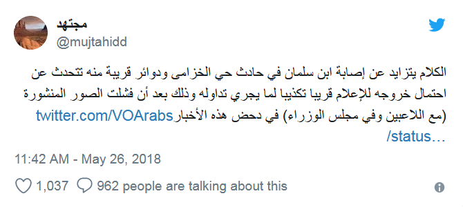 C’est aussi l’avis du célèbre twitteur saoudien Moujtahid connu pour ses révélations crédibles des dessous du royaume et de la famille royale en particulier . Le 26 mai dernier, il avait lui aussi fait allusion dans un tweet que l’héritier du trône allait faire une apparition publique surtout que les récentes photos qui lui ont été publiées avec les footballeurs (de l’équipe nationale) en réunion avec le conseil des ministres n’ont pu contrer ces informations ».