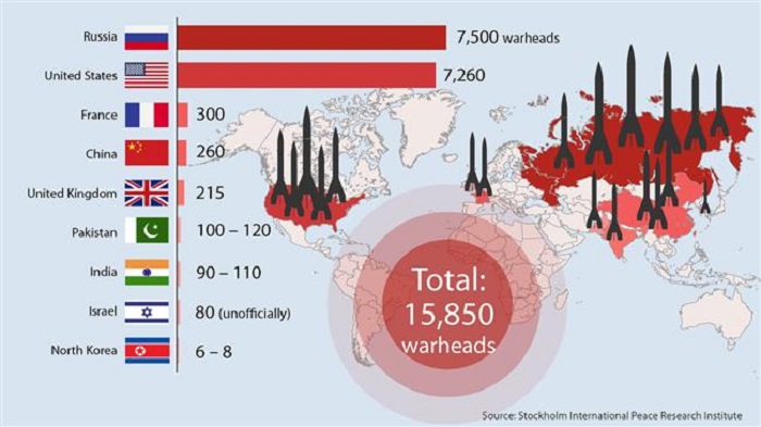 Selon l’Institut international de recherche sur la paix de Stockholm (SIPRI), consacré aux conflits, à l’armement, au contrôle des armes et au désarmement, plus de 14000 ogives nucléaires existent dans le monde dont 80 sont à la disposition de l’entité sioniste.
