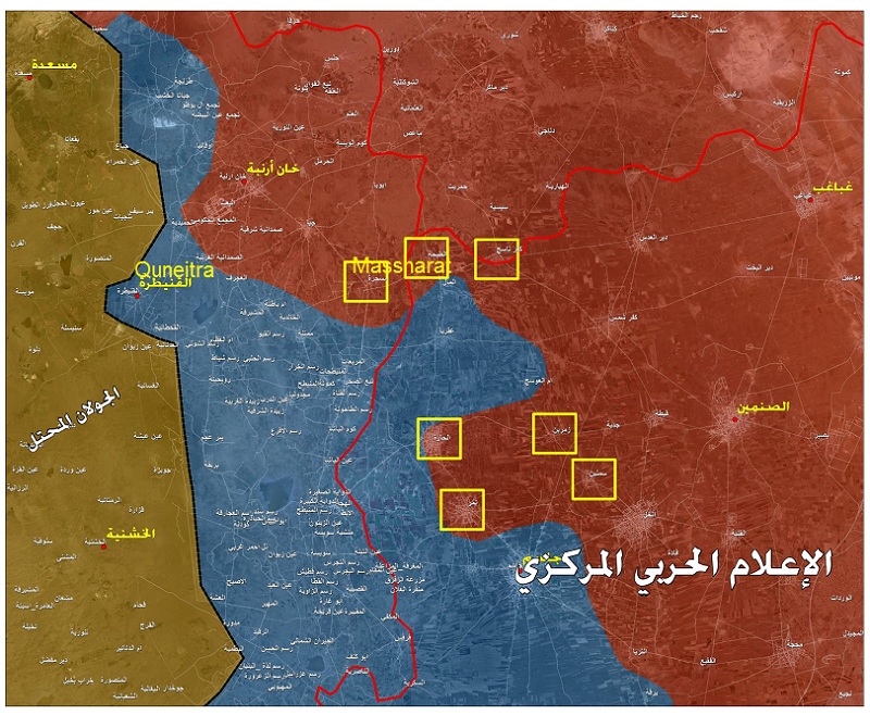 Selon l’agence syrienne Sana, l’armée syrienne a conquis la localité de Massharat et sa colline, situées dans le centre de la province de Quneitra, première étape pour conquérir cette province située aux confins avec le Golan occupé par Israël.